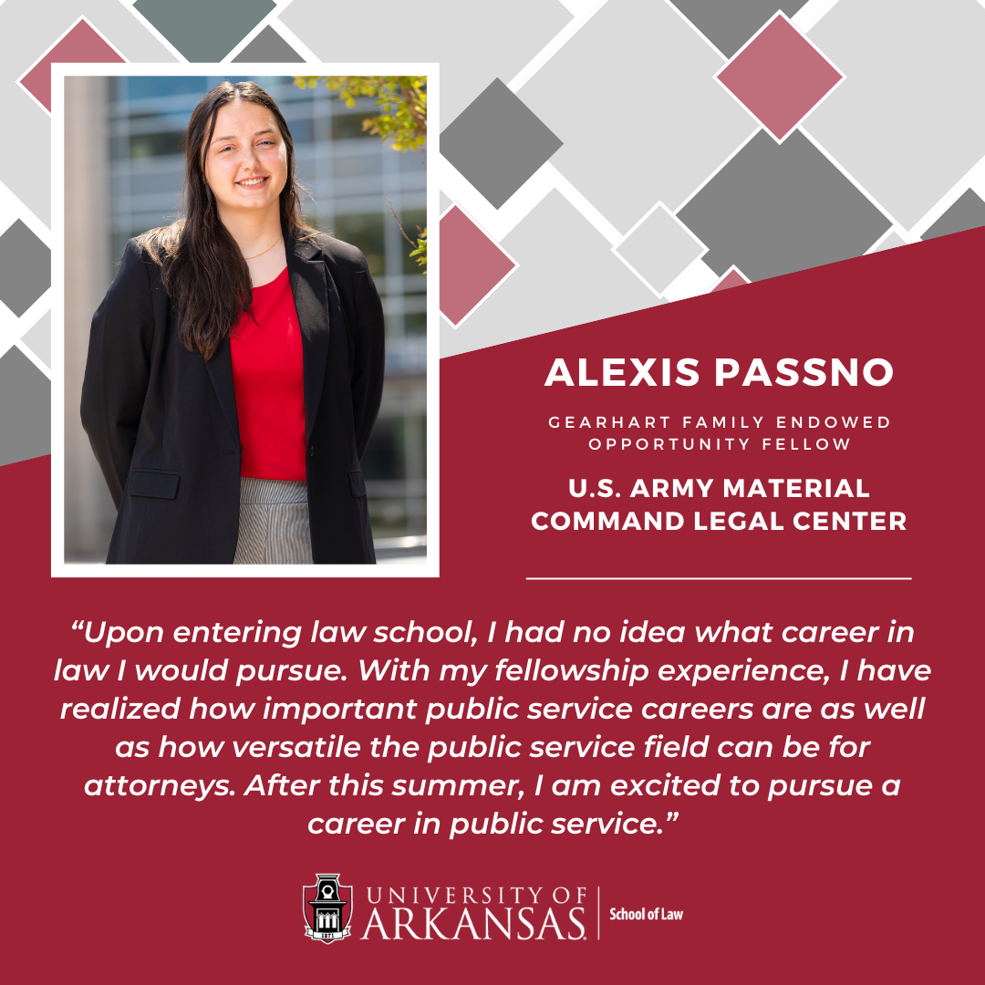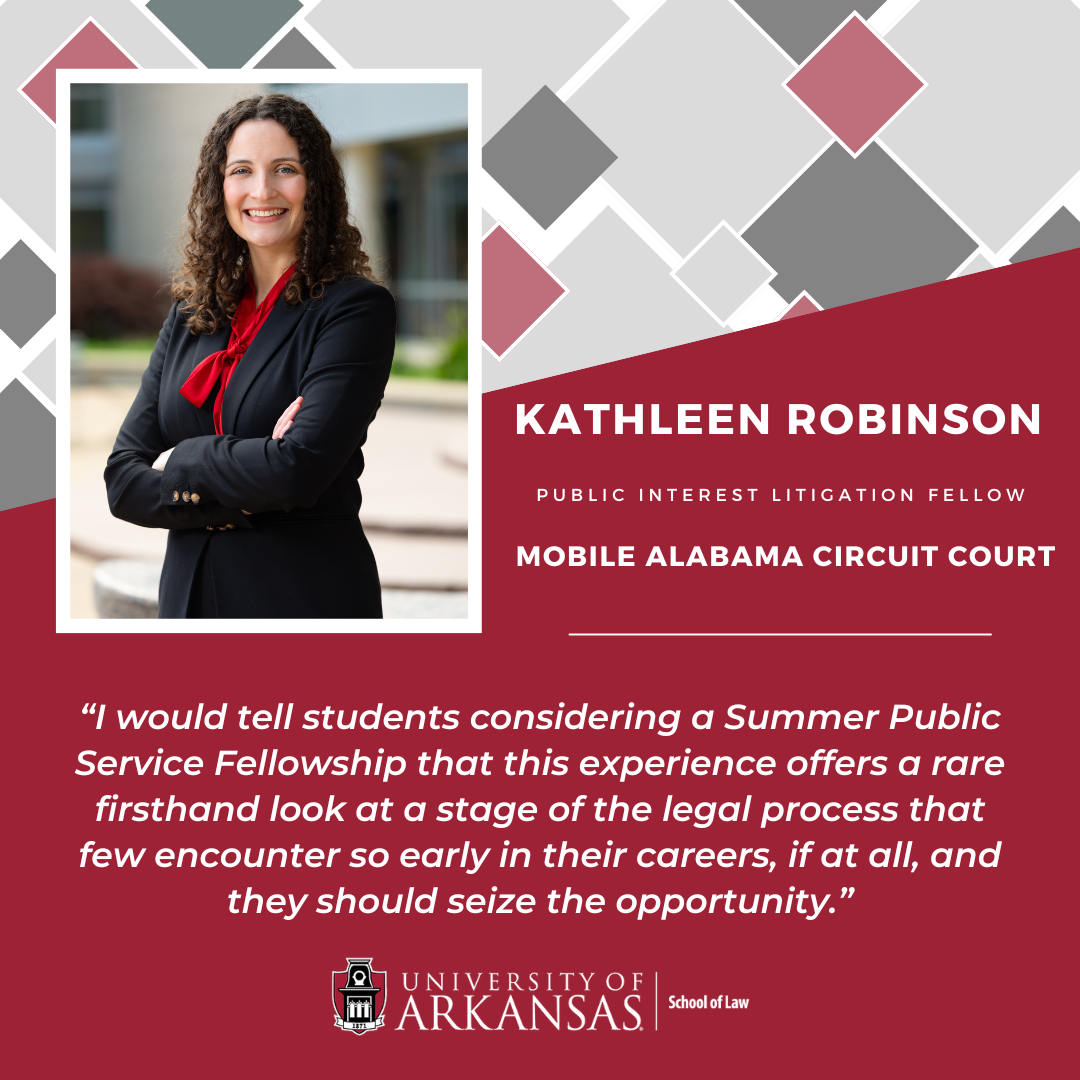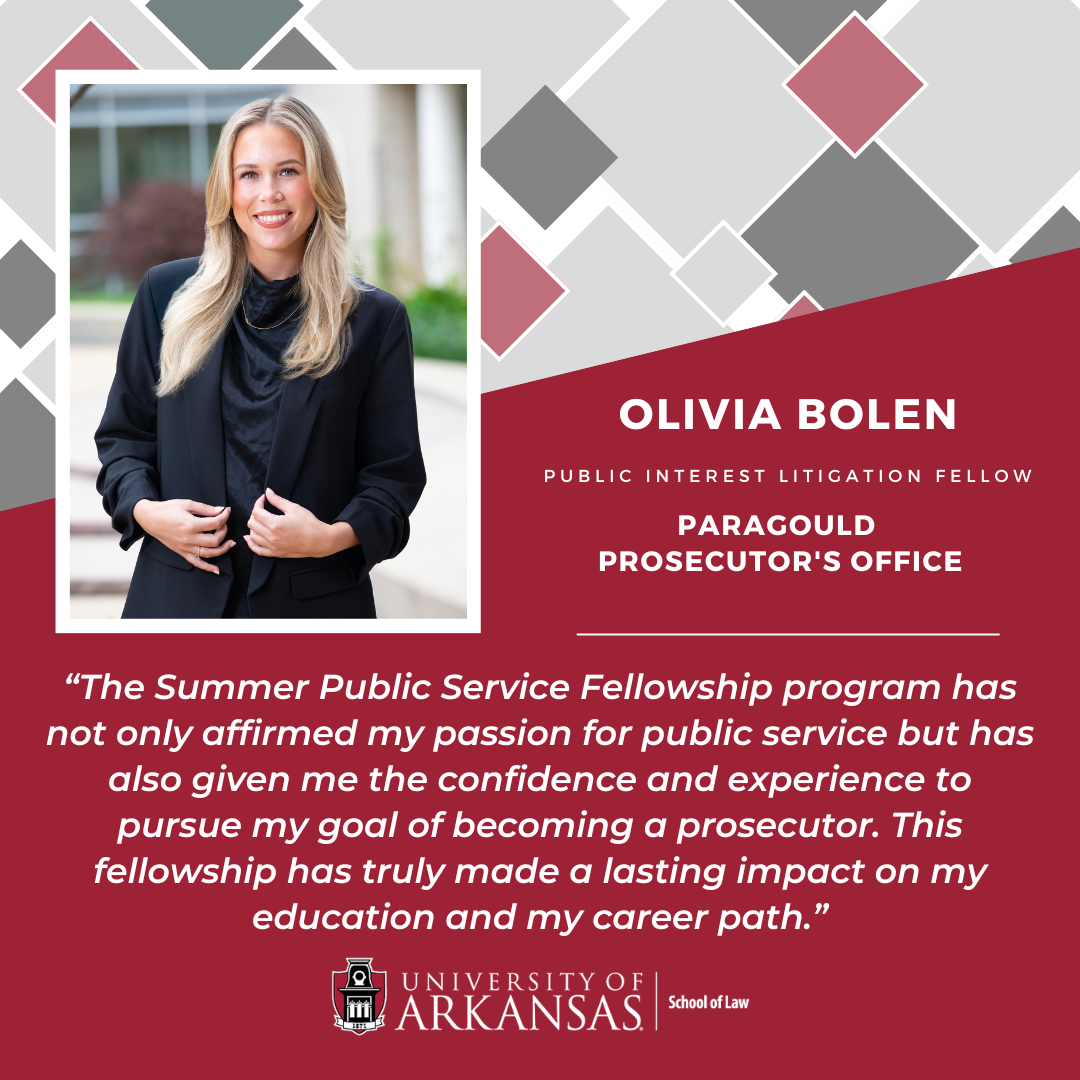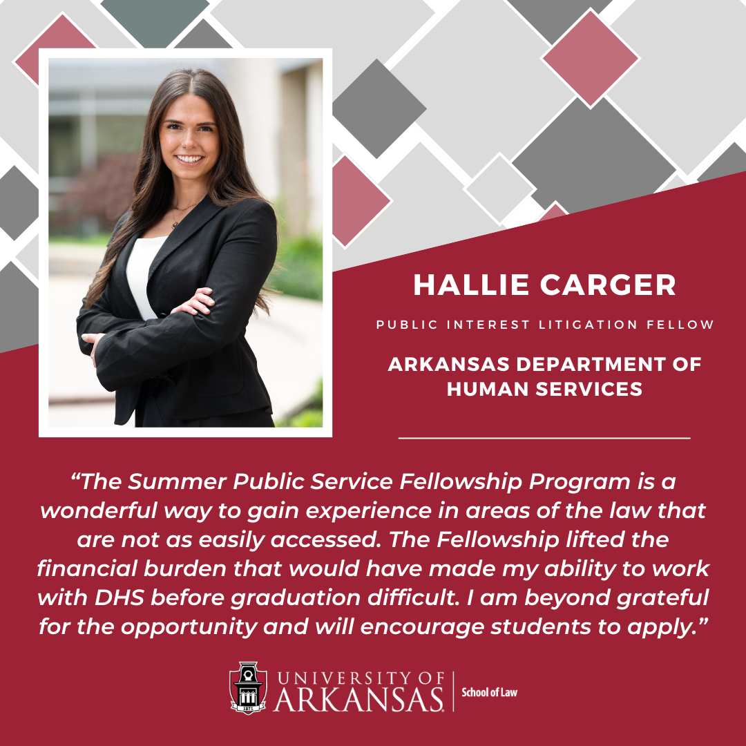 The University of Arkansas School of Law Summer Public Service Fellowship Program provides paid public service fellowships to promising law students interested in public service careers. It offers meaningful employment opportunities and provides legal services to non-profit, non-governmental, and governmental entities that cannot otherwise afford summer interns.